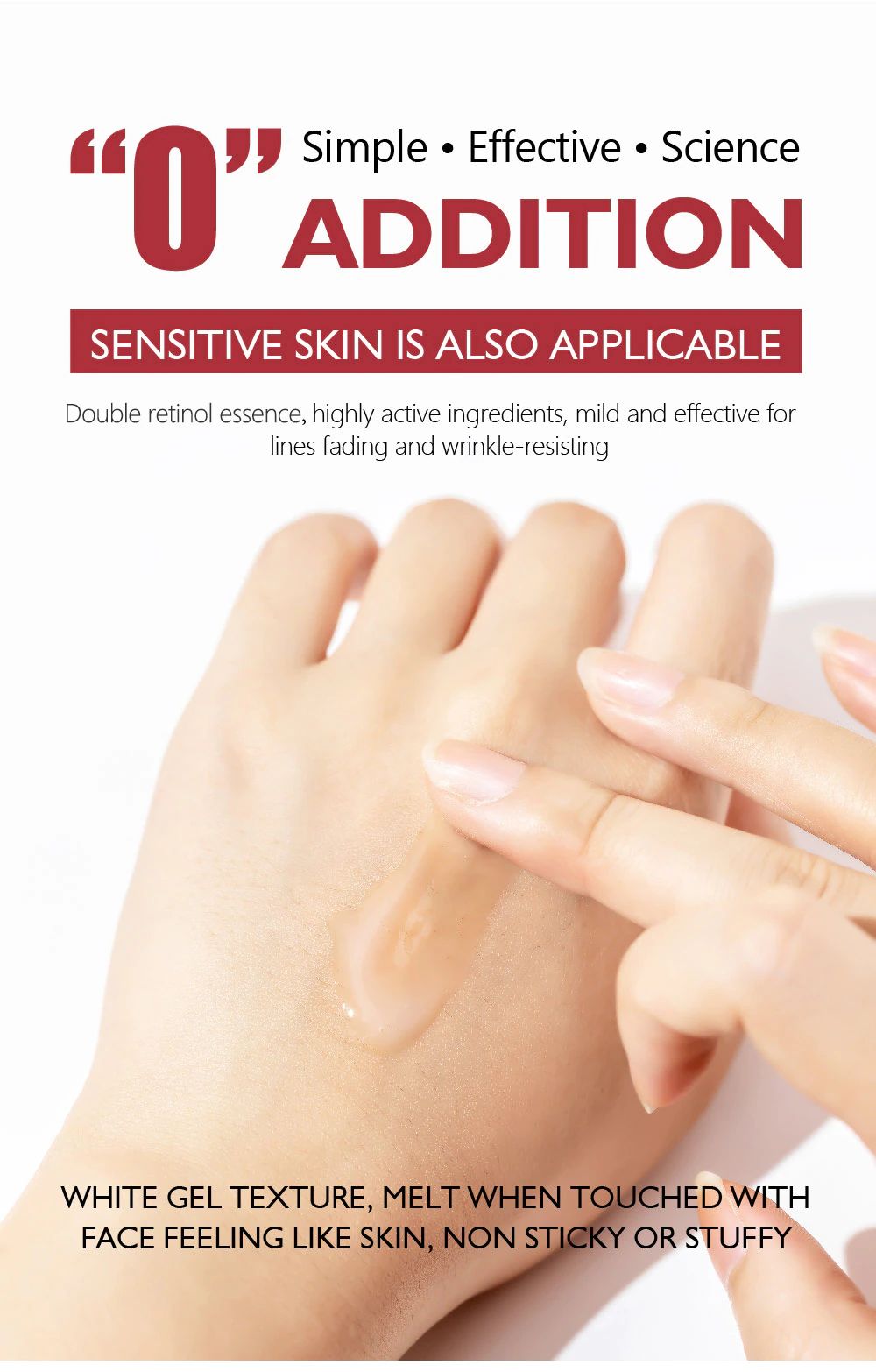 11.[Details]:Retinol with active peptide acetyl hexapeptide-8, dual nourishing ingredients, effectively improve skin luster, lock moisture, improve coarse lines, fade fine lines, relieve skin and firm elasticity, dense repair with essence; Shine thoroughly, shows moisturizing and smooth skin!