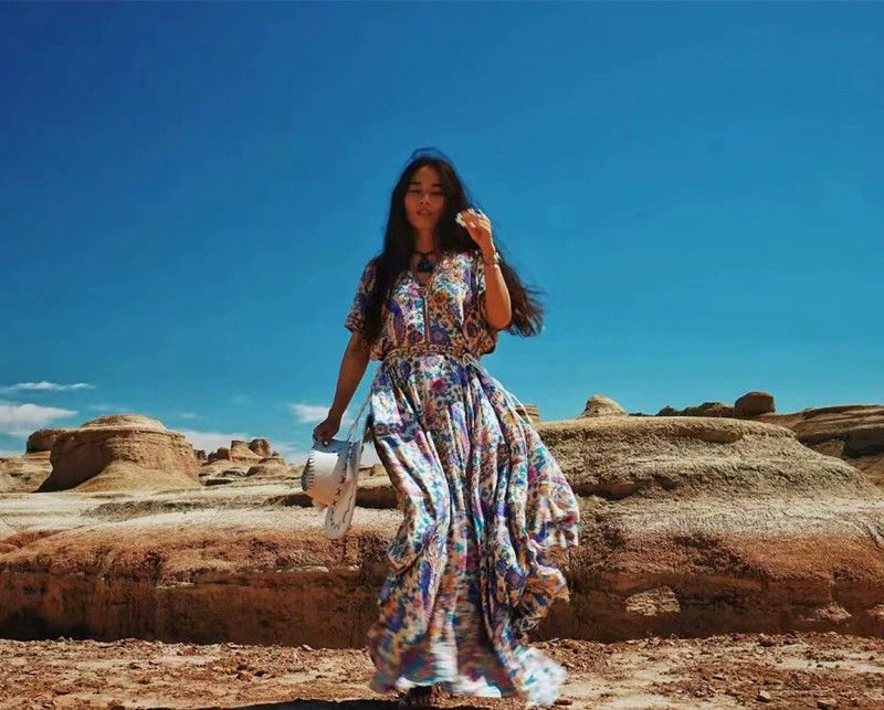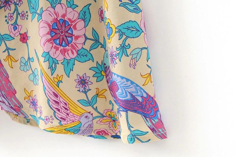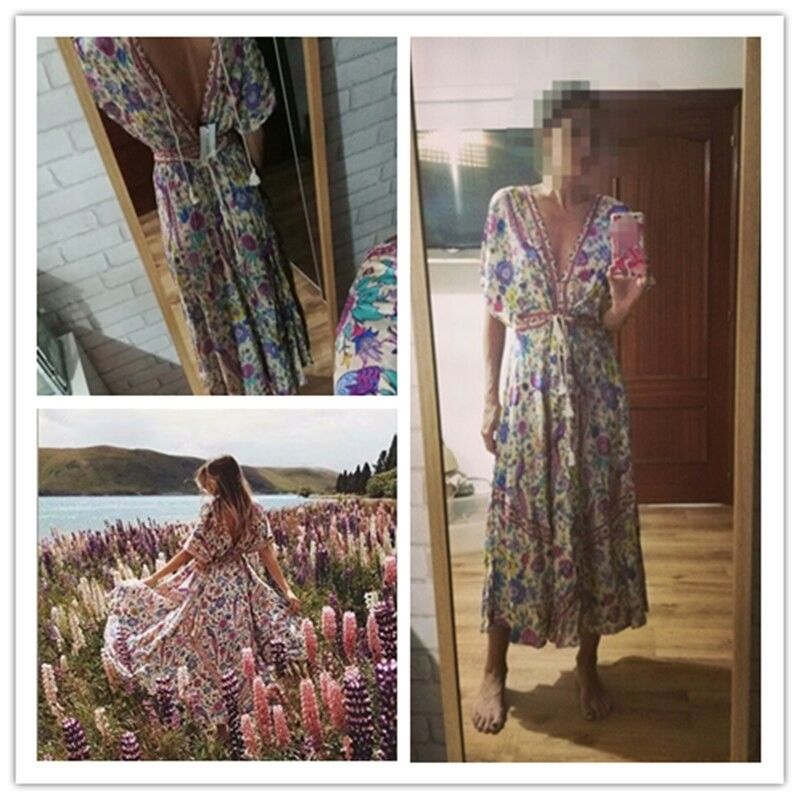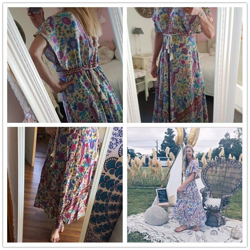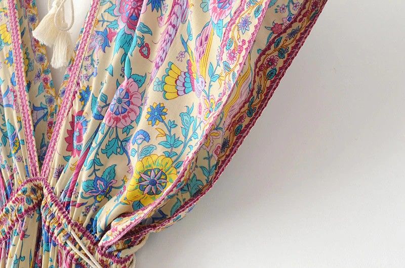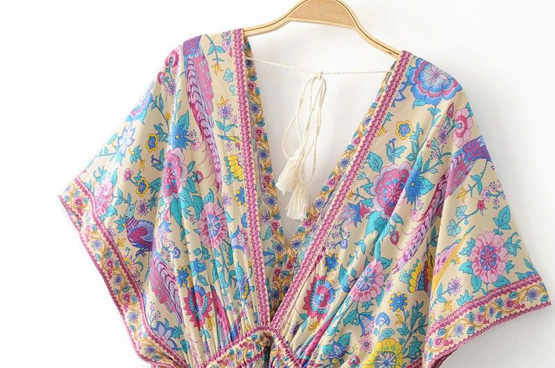 Vintage Chic Women Peacock Floral Print Bat Sleeve Beach Bohemian Maxi Dress Ladies V-Neck Tassel Summer Boho Sundress