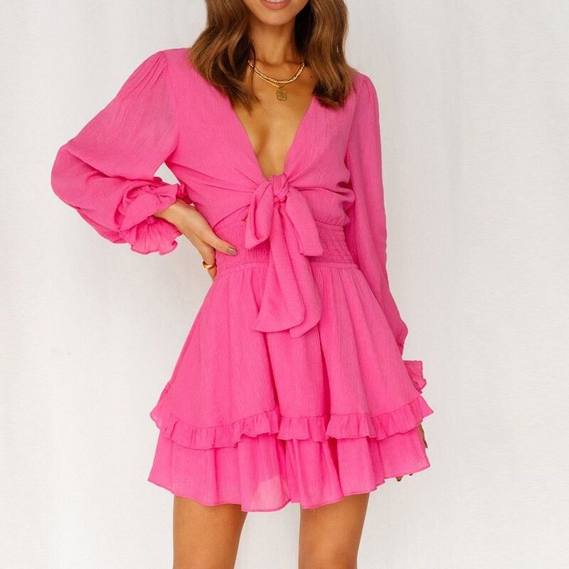 Women Spring V Neck Chiffon Print Dress Self-Tie Knot Front Ruffles Leopard Dress Female Sexy Short A Line Party Vestidos Newest