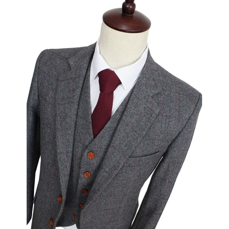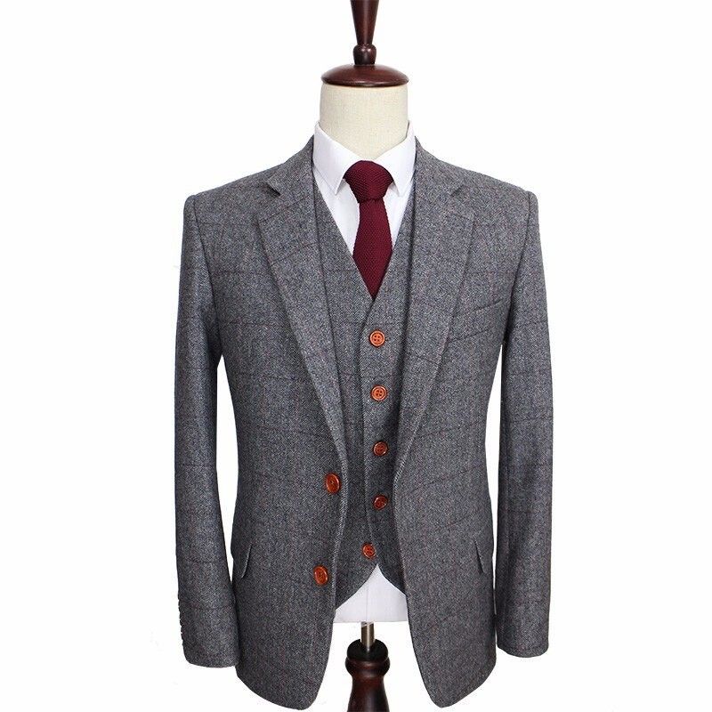 Wool Retro Grey Herringbone Tweed British Style Custom Made Mens Suit Tailor Slim Fit Blazer Wedding Suits For Men 3 Piece