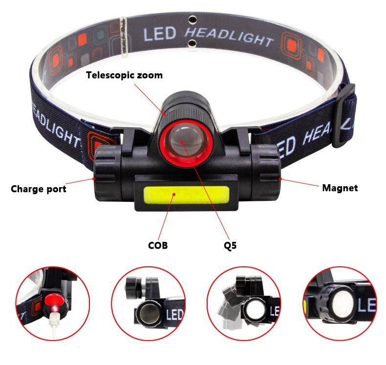 Zhiyu Portable Mini Flashlight Q5+Cob Led Headlamp High Power Built-In 18650 Battery Camping Headlight Stepless Dimming